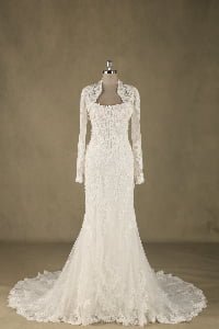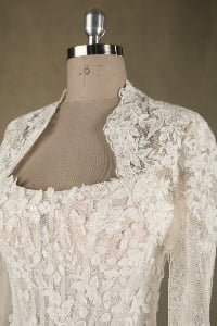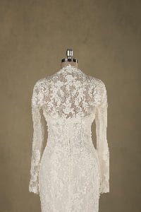 “Aristocratic is a stunning example of sartorial versatility and refined craftsmanship, featuring a meticulously structured sheer corset bodice with sophisticated exposed boning that perfectly shapes the silhouette. The gown is entirely enveloped in lush, multidimensional floral lace appliqués, which flow seamlessly into a statuesque fit-and-flare skirt and a delicate scalloped train. The most captivating feature is the detachable high-neck lace bolero with elegant long sleeves, offering brides a modest, high-fashion look for the ceremony that can be effortlessly removed to reveal a daring, romantic strapless style for the celebration.