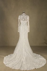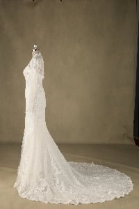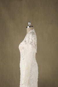 Exuding an aura of aristocratic grace and modern romance, this gown is designed for the bride who cherishes tradition but demands a contemporary edge. It evokes the splendor of a grand cathedral wedding or a sophisticated winter gala, where the intricate lace textures harmonize with a sense of timeless luxury. The Valentina offers an “”editorial”” presence that commands attention, ensuring the bride transitions from her grand entrance to her first dance with a captivating, multi-layered story of elegance and style.”