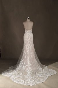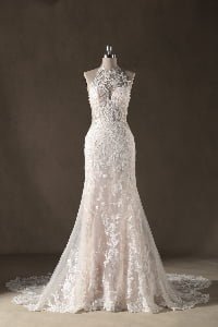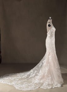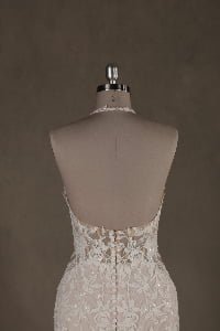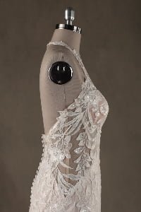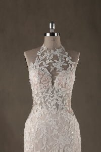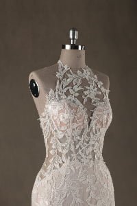 “Bohemiana is a mesmerizing showcase of organic textures and sculptural precision, featuring a sophisticated high-neck halter illusion bodice that seamlessly flows into a dramatic open-back concept. The gown is enveloped in intricate vine-inspired lace appliqués that wind artfully across the sheer mesh, creating a stunning “”tattoo-lace”” effect against the skin. This elaborate lacework extends through the fitted bodice into a gracefully flared trumpet silhouette, while a soft nude-honey underlay provides a warm contrast that allows every delicate floral and leaf motif to stand out in brilliant detail.