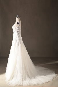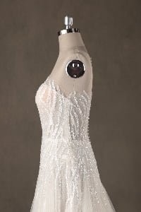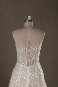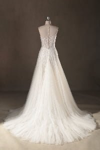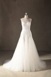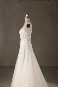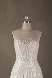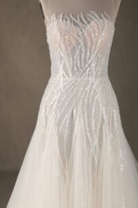 “Celeste features an exquisite illusion high-neckline adorned with organic, flowing sequin embroidery that mimics the graceful movement of light. The shimmering patterns transition seamlessly from the structured bodice into a voluminous multi-layered tulle skirt, creating a classic A-line silhouette with a modern, high-glamour twist.