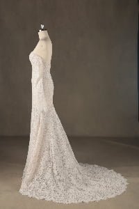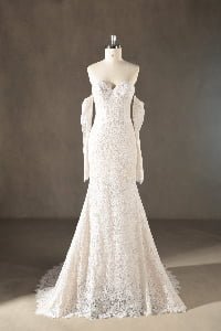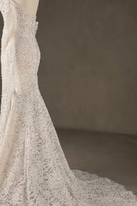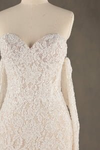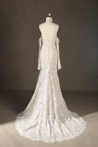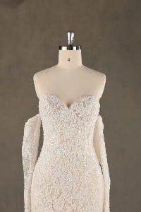 “Eliana is a stunning showcase of intricate floral lace, featuring a timeless sweetheart neckline and graceful detachable lace gauntlets. The fit-and-flare mermaid silhouette is meticulously designed to celebrate the feminine form, flowing into a beautifully scalloped lace train that adds a vintage-inspired elegance.