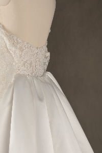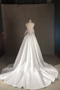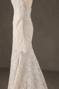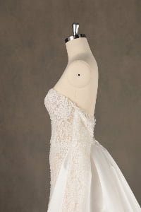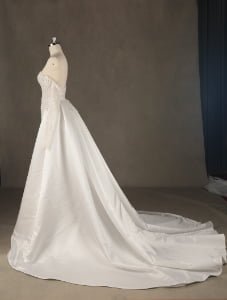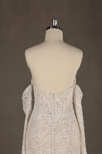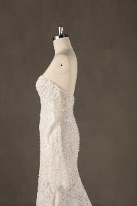 This gown exudes timeless sensuality, blending traditional bridal romance with a modern, body-conscious fit. It evokes the feeling of a romantic garden gala, offering a versatile look that transitions from a classic ceremony to a spirited celebration with effortless ease.”