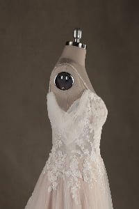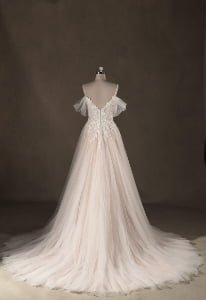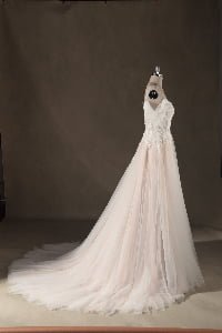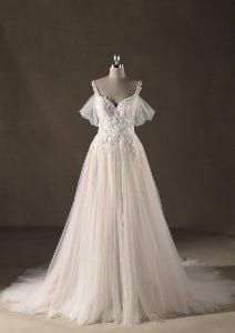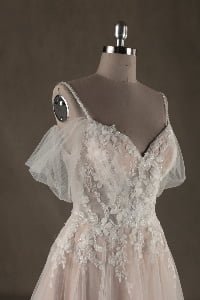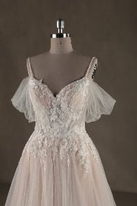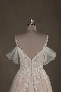 “Ethereal is a breathtaking celebration of soft textures and feminine details, featuring a classic sweetheart neckline supported by delicate spaghetti straps. The bodice is artfully adorned with intricate floral lace appliqués that trail gracefully onto a voluminous A-line skirt, while a subtle blush underlay provides a modern, warm glow that makes the ivory lace motifs pop with exceptional clarity. The standout feature is the detachable sheer tulle flutter sleeves, offering brides the versatility to transition from a romantic ceremony look to a sleek, effortless reception style.