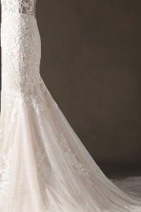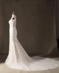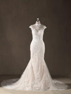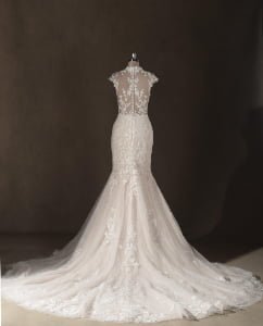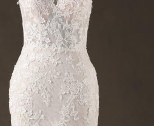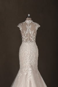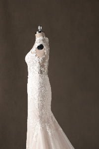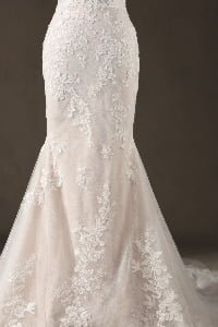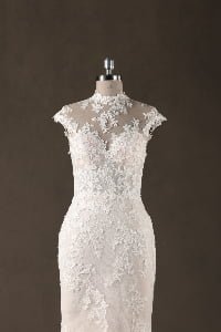 “Genevieve features an exquisite high-neck illusion bodice with cap sleeves, where delicate lace appliqués create a “”tattoo-effect”” across the skin. The mermaid silhouette is layered over a subtle champagne lining, which allows the intricate ivory floral embroidery to pop with stunning, three-dimensional depth.