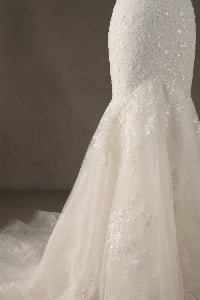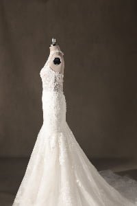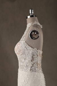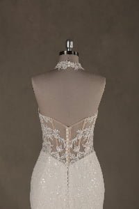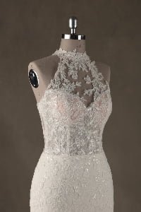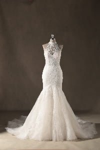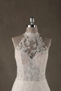 “Halter is a stunning example of artisanal lace-work, featuring an exquisite illusion halter neckline that transitions into a meticulously detailed bodice. The gown is enveloped in intricate floral embroidery and delicate beadwork, which follows the contours of the body before flaring into a dramatic, voluminous tulle mermaid skirt. A subtle champagne underlay provides a modern contrast, allowing the ivory lace motifs to pop with three-dimensional depth and exceptional clarity.