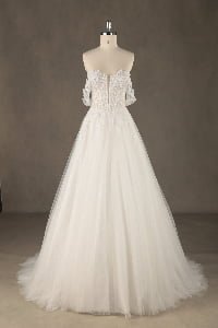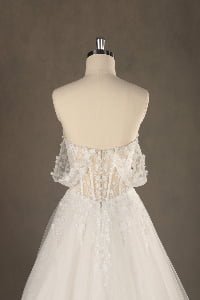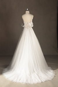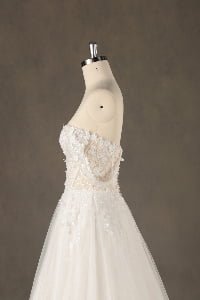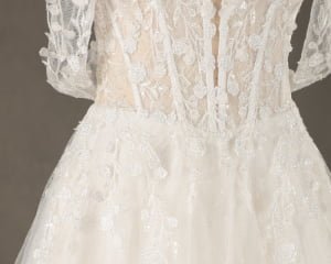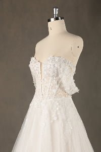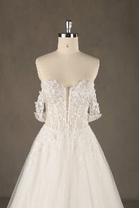 “Isabella is a masterpiece of artisanal texture, featuring a meticulously crafted exposed boning corset bodice that creates a defined, sculpted silhouette. Delicate off-the-shoulder sleeves transition into an expansive ballgown skirt, all lavishly adorned with hand-placed 3D floral lace appliqués and intricate botanical embroidery that seems to bloom across the shimmering tulle.