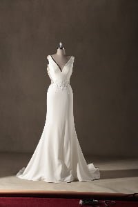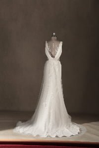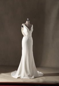 This gown exudes effortless sophistication, blending metropolitan chic with subtle romantic details. It is designed for the modern muse seeking a polished, high-fashion look that transitions seamlessly from a chic city ceremony to an intimate evening reception.”