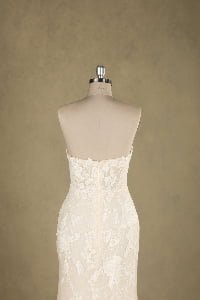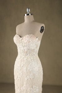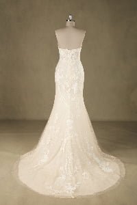 “Opulence is a stunning celebration of romantic texture, featuring a timeless strapless sweetheart neckline that perfectly frames the décolletage. The silhouette is a masterfully tailored trumpet cut, designed to hug the curves through the hips before flaring into a soft, ethereal train. The gown is meticulously layered with delicate floral lace appliqués and intricate embroidery, all set against a shimmering sequin-infused underlay that catches the light with every movement, creating a sophisticated three-dimensional glow.