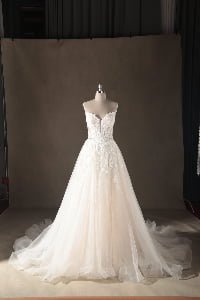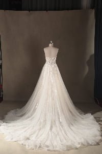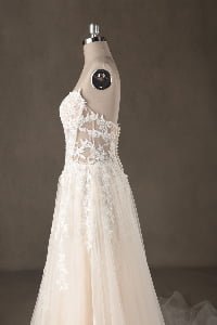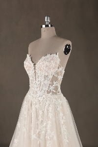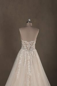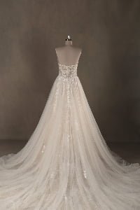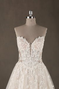 “Seraphina features an intricate illusion lace bodice with a daring deep-V neckline, adorned with delicate botanical embroidery that trickles down the waist. The dramatic voluminous tulle skirt creates a classic ballgown silhouette, finished with a spectacular cathedral-length train that adds a regal touch to the romantic design.