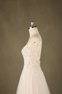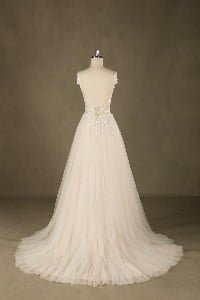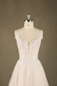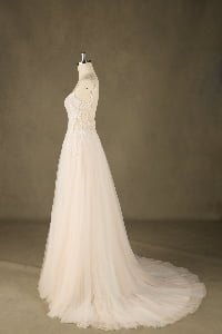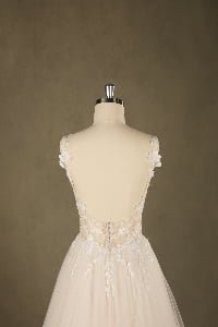 Radiating an air of whimsical enchantment and timeless femininity, this gown is designed for the bride who envisions a wedding straight from a contemporary fairy tale. It evokes the magic of a garden ceremony at golden hour or a romantic woodside celebration where the soft blush tones harmonize with the natural light. The Seraphine offers a weightless, dreamlike movement, ensuring a presence that is both effortlessly chic and deeply romantic—a versatile addition for any boutique looking to capture the hearts of brides seeking a touch of color and ethereal grace.”