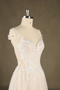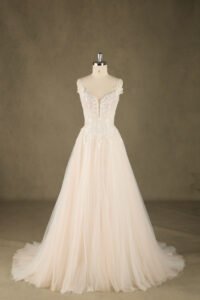 “Seraphine is a masterclass in soft romanticism, featuring a delicate plunging sweetheart neckline supported by enchanting scalloped lace straps that frame the décolletage with botanical elegance. The bodice is meticulously adorned with organic floral lace appliqués and subtle crystalline embellishments that shimmer with every turn. These intricate details cascade gracefully past the natural waistline into a voluminous, multi-layered ethereal tulle skirt in a soft, sun-kissed blush hue, creating a striking contrast that highlights the white floral motifs.